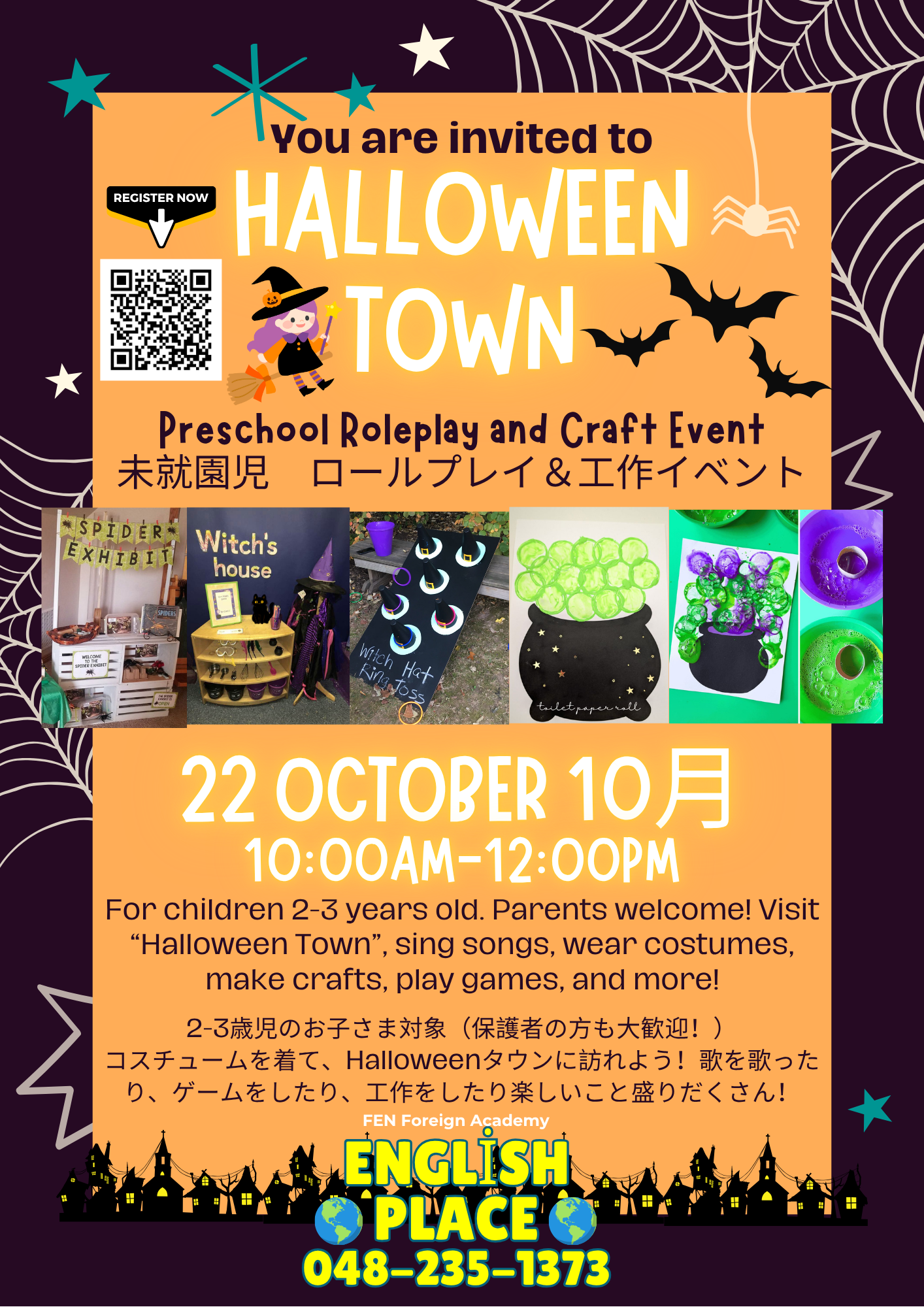 ハロウィーンの工作をしたり、ハロウィーンタウンのロールプレイ(おままごと)を英語で楽しもう♪